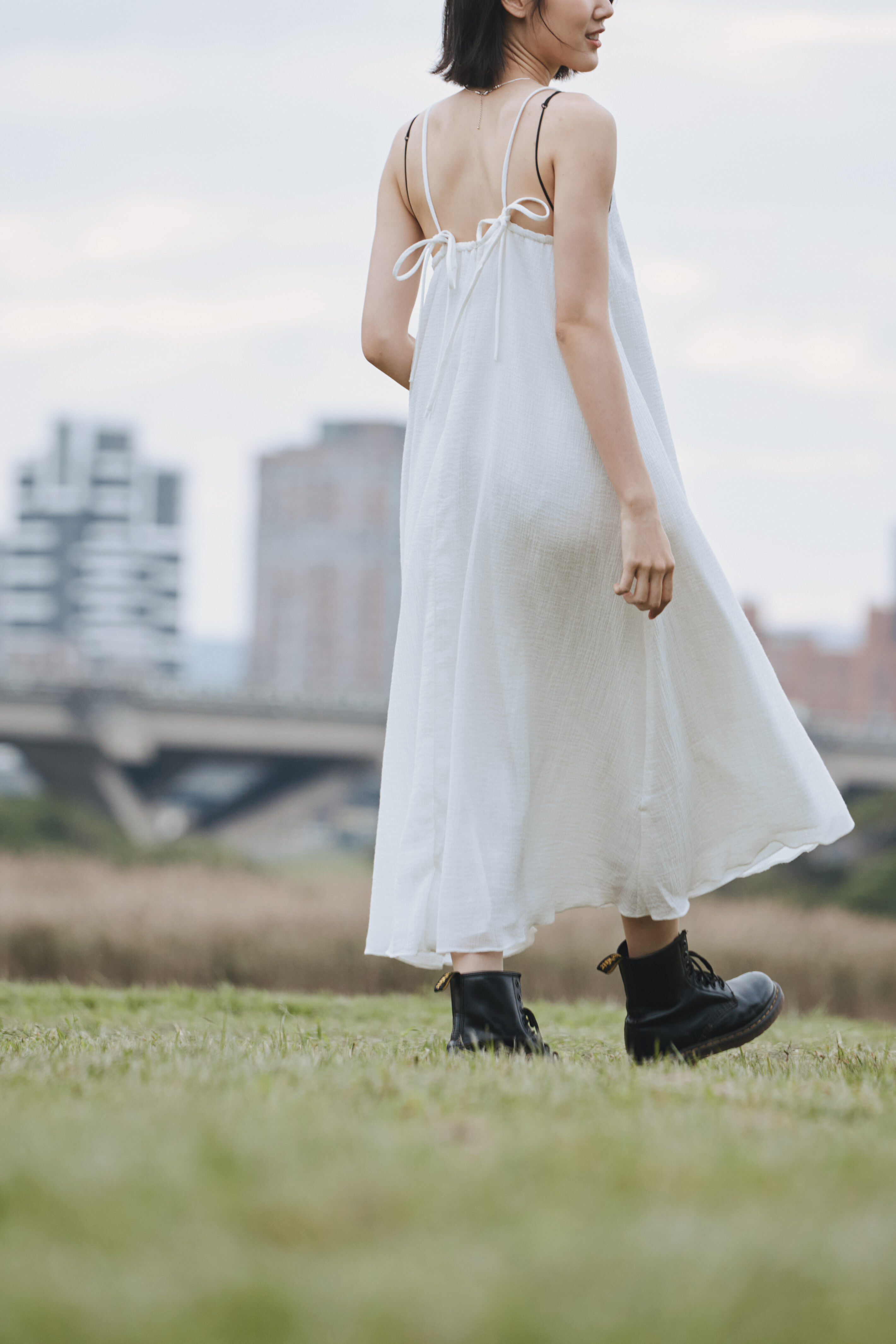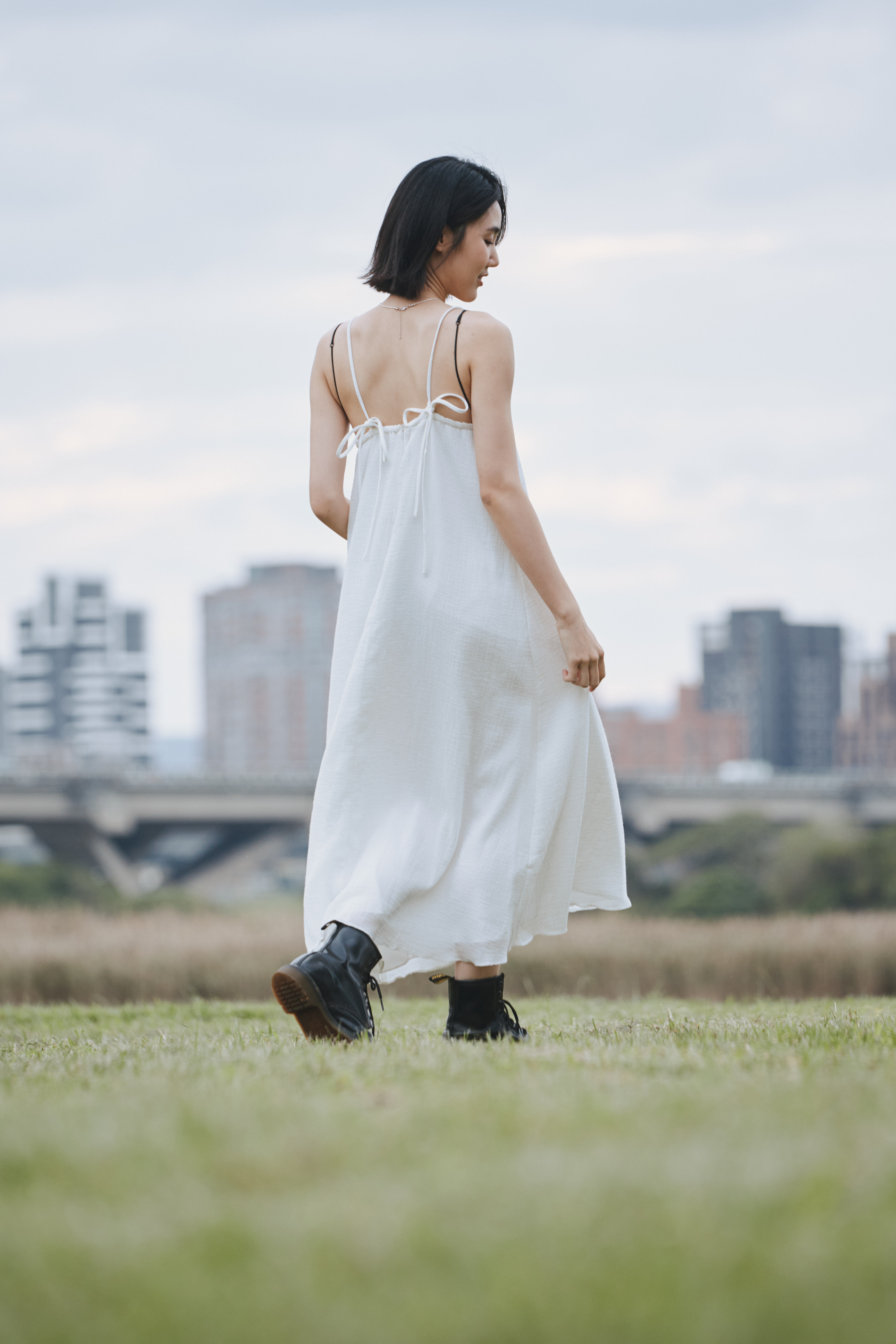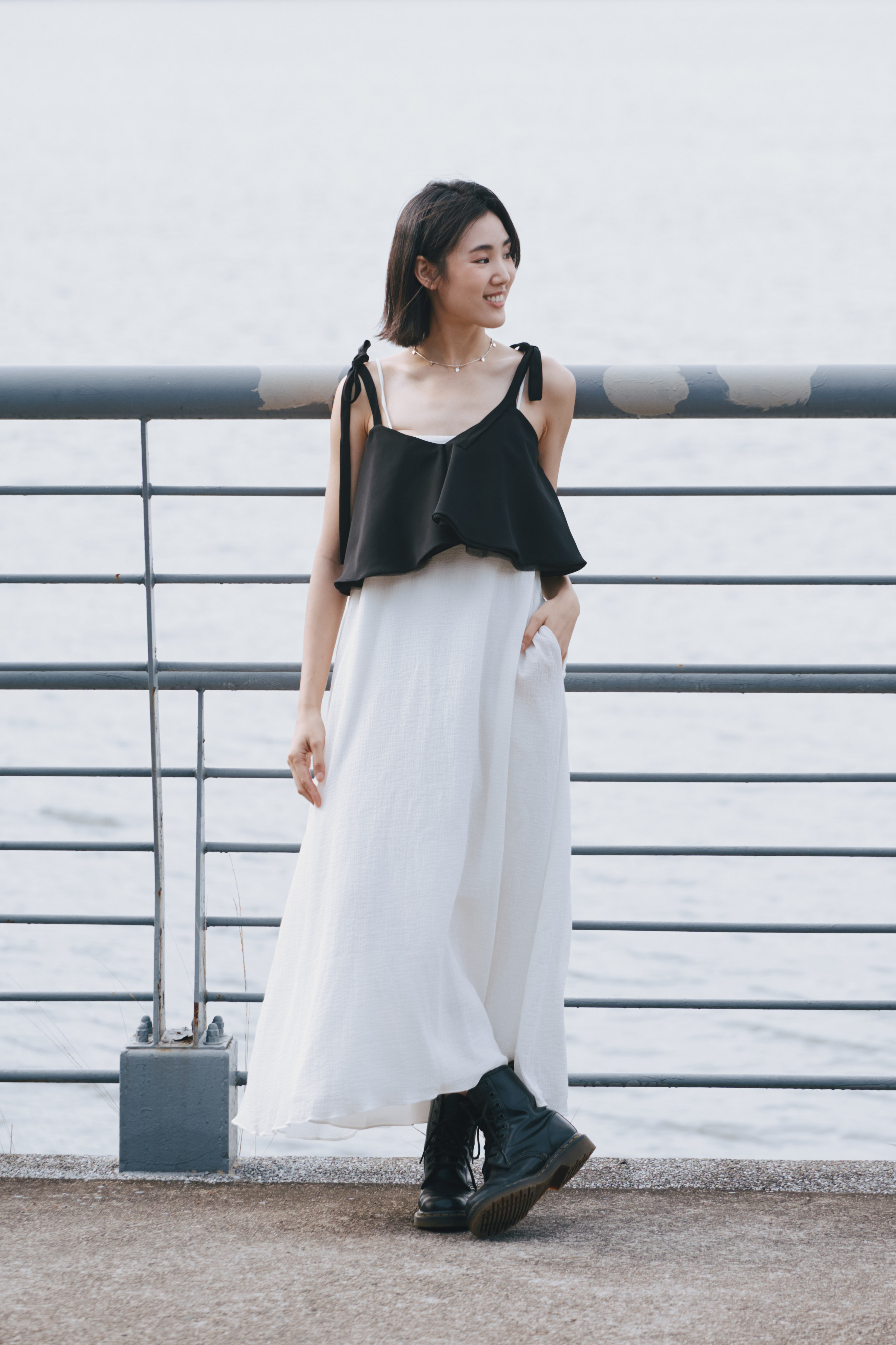 黑色的裙身帶有自然的垂墜線條,隨步伐產生柔和搖曳。