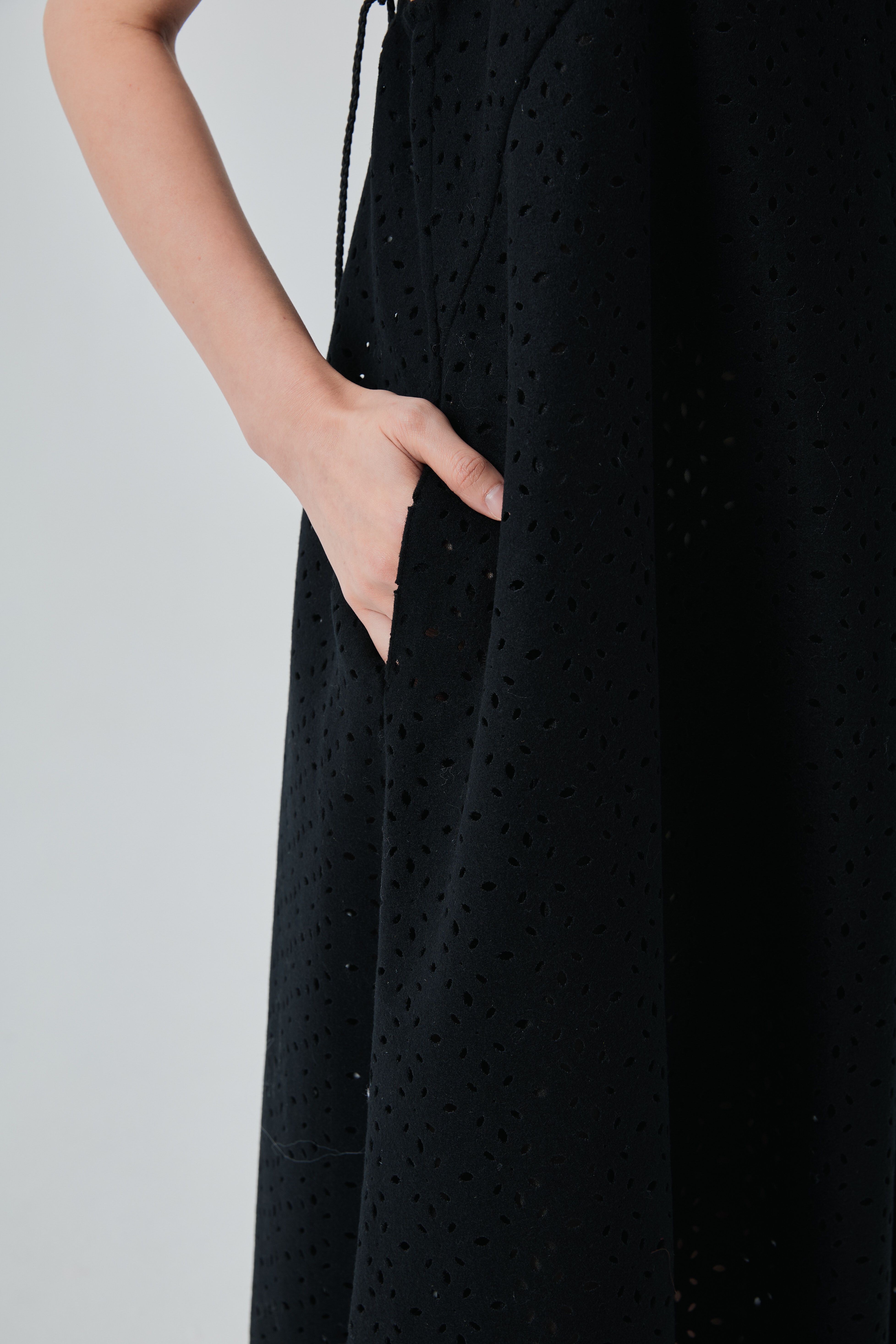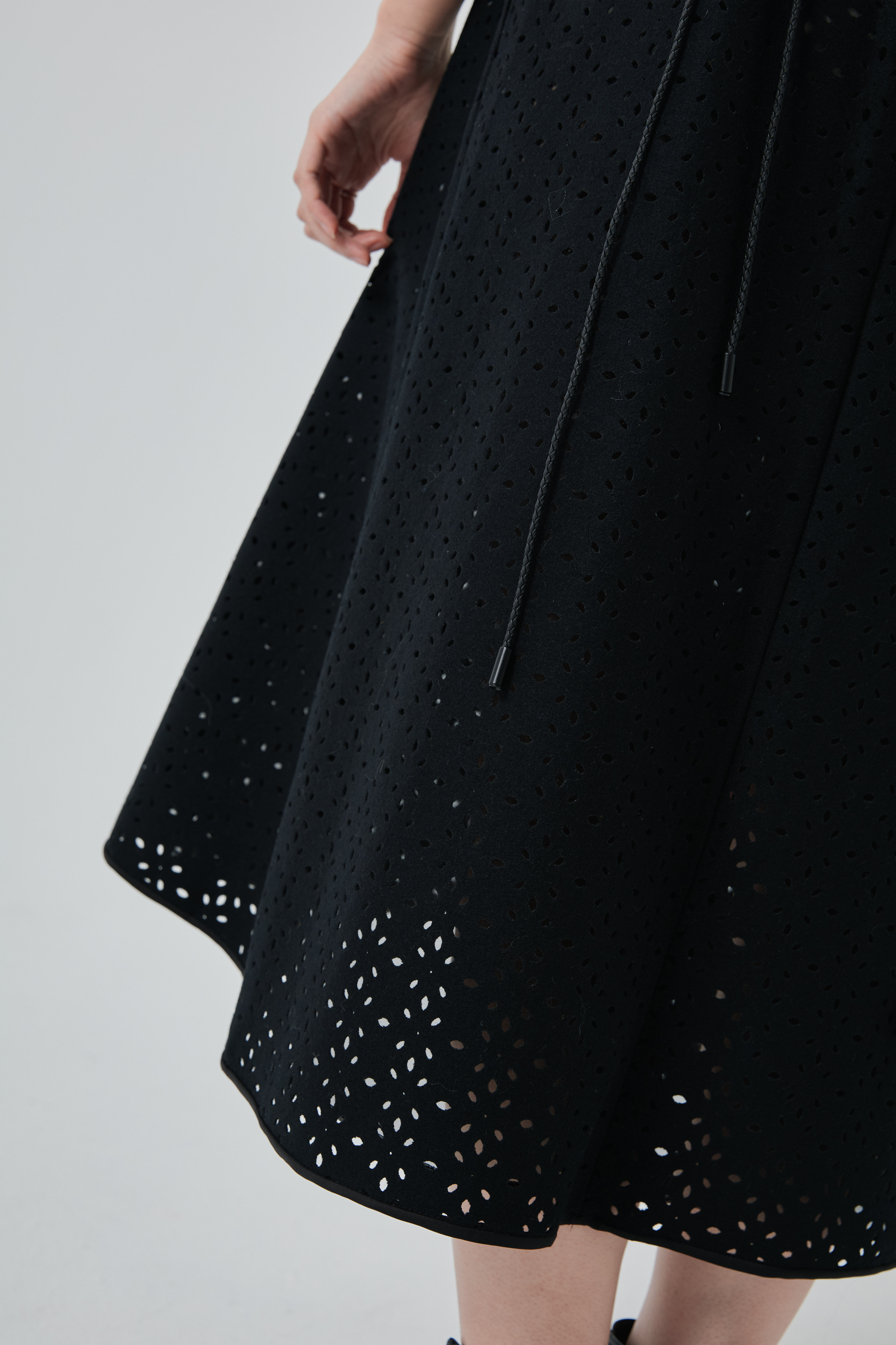 下擺的透光孔洞創造俐落又具層次的剪影,讓黑色更顯立體。