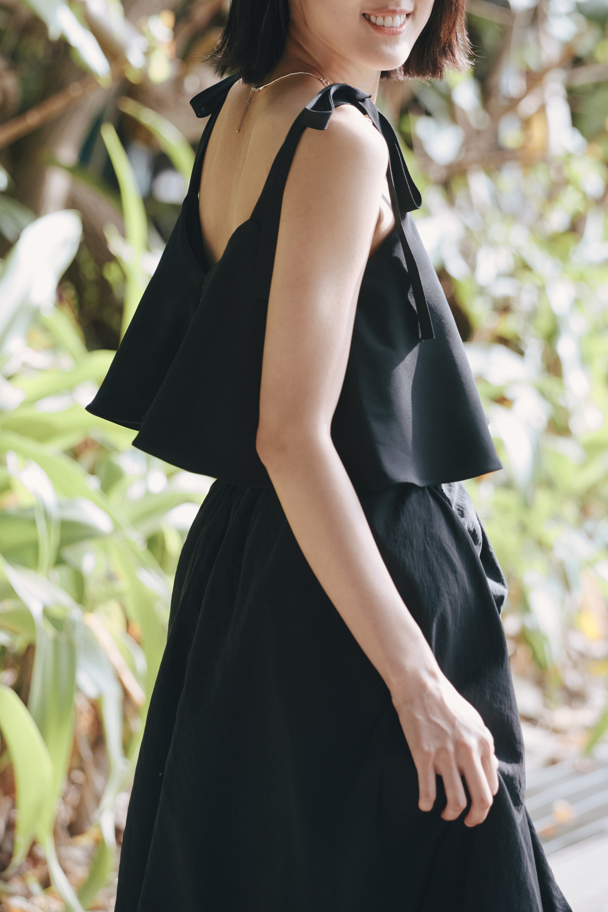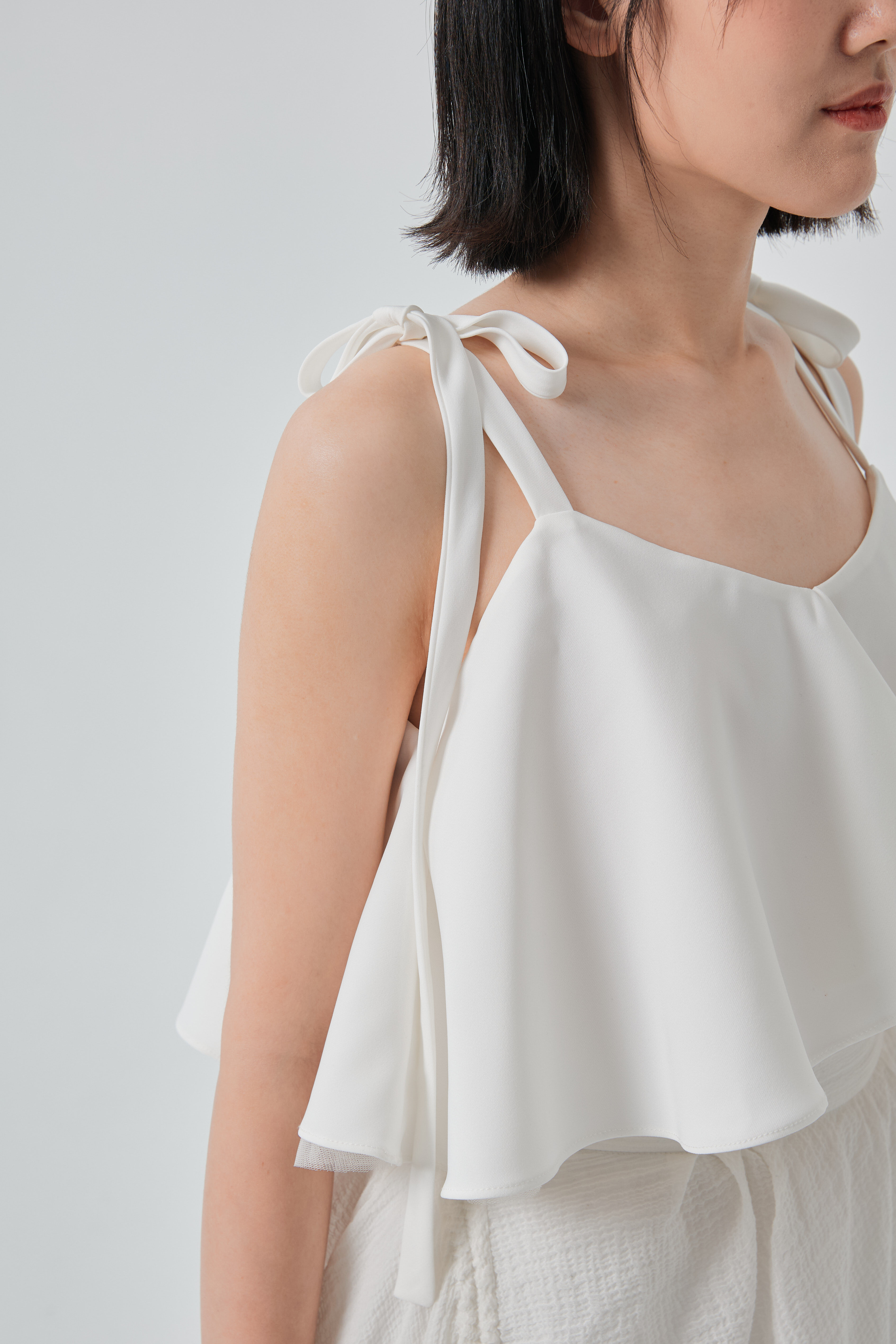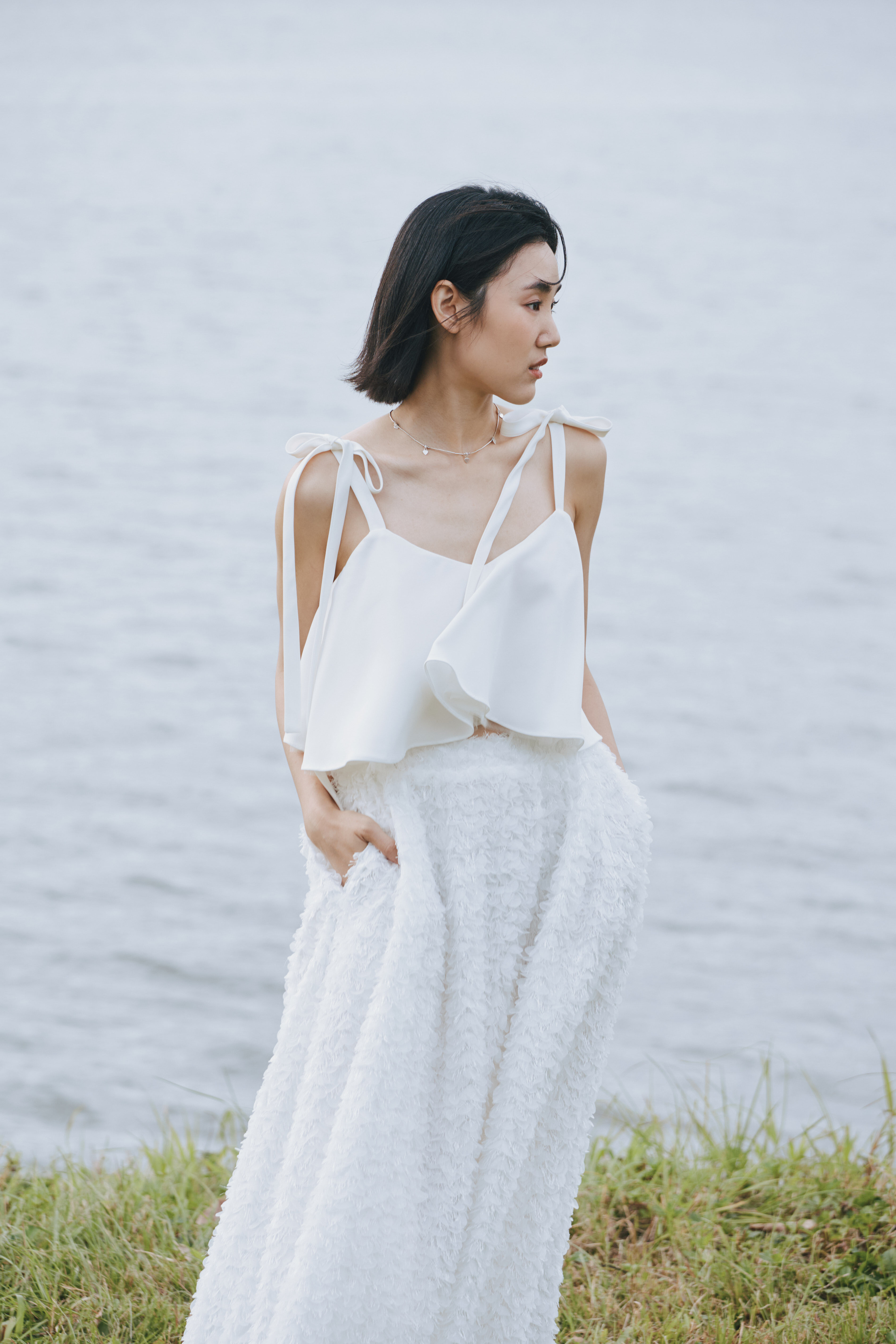 細緻蝴蝶結停在肩上,為整體添上一抹不經意的浪漫。